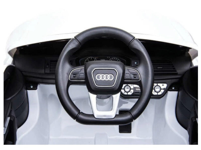 Audi Q5 (S305) wit Vermogen/accu: 12 volt 7Ah accu Motor: 2x 12 volt 40 watt motoren, een motor op elk achterwiel Rijden: 3 instelbare snelheden tot 5 km per uur, rijdt zowel vooruit als achteruit met ‘soft start’, werkt met het gaspedaal en met de afstandsbediening, elektronische rem wanneer het gaspedaal wordt losgelaten Verlichting: Led-verlichting: koplampen, achterlichten en dashboardverlichting Muziek / Multimedia: Claxon en muziekknoppen, muziekmodule met MP3- en USB-ingang om je eigen muziek af te spelen, volume is regelbaar, accu-indicator Bijzonderheden: 2 echte deuren, rubberen EVA-banden, kunstlederen stoel met veiligheidsgordel, 4-wielophanging, handgreep met kleine wielen om hem te verslepen als een koffer Afstandsbediening: 2,4 GHz afstandsbediening met instelbare snelheden en pauzeknop Opladen & speeltijd: 8 uur opladen, 60-90 minuten speeltijd op een vlakke weg Inbegrepen: Afstandsbediening, batterij en oplader Aantal zitplaatsen: 1 zitplaats Geschiktheid: Voor kinderen tot 5 jaar tot 30 kg Afmetingen product: 125 x 75 x 55 cm (lengte x breedte x hoogte) Afmetingen verpakking: 126 x 65 x 47 cm (lengte x breedte x hoogte) Let op: als gevolg van het fabricageproces kunnen er vlekken, krassen, stippen of schrammen op het elektrische speelgoed zitten. Soms zijn onderdelen niet 100% naad-op-naad afgewerkt. Dit komt vaak voor en geldt voor alle modellen, ongeacht waar je ze koopt.