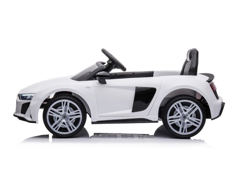 Audi R8 Sport (A300) wit Vermogen/accu: 12 volt 4,5 Ah accu Motor: 2x 12 volt motoren, een motor op elk achterwiel Rijden: 3 instelbare snelheden tot 6 km per uur, rijdt zowel vooruit als achteruit met ‘soft start’, werkt met het gaspedaal en met de afstandsbediening, elektronische rem wanneer het gaspedaal wordt losgelaten Verlichting: Led-verlichting: koplampen Muziek / Multimedia: Claxon en muziek- en verhaaltoetsen, muziekmodule met TF-, MP3- en USB-ingang om eigen muziek af te spelen, volume is regelbaar, batterij-indicator Bijzonderheden: 2 deuren, rubberen EVA banden, kunstlederen stoel met veiligheidsgordel, achterwielophanging Afstandsbediening: 2,4 GHz afstandsbediening met instelbare snelheden en pauzeknop Opladen & speeltijd: 8 uur opladen, 60-90 minuten speeltijd op een vlakke weg Inbegrepen: Afstandsbediening, batterij en oplader Aantal zitplaatsen: 1 zitplaats Geschiktheid: Voor kinderen tot 5 jaar tot 30 kg Afmetingen product: 107 x 58 x 48 cm (lengte x breedte x hoogte) Afmetingen verpakking: 107,5 x 55 x 26 cm (lengte x breedte x hoogte) Let op: als gevolg van het fabricageproces kunnen er vlekken, krassen, stippen of schrammen op het elektrische speelgoed zitten. Soms zijn onderdelen niet 100% naad-op-naad afgewerkt. Dit komt vaak voor en geldt voor alle modellen, ongeacht waar je ze koopt.
