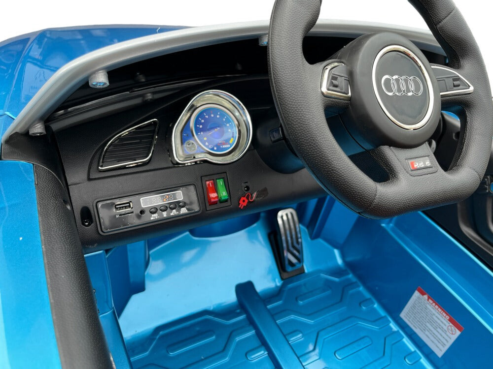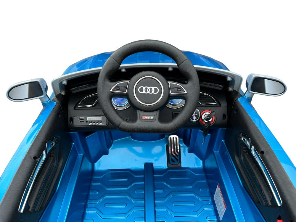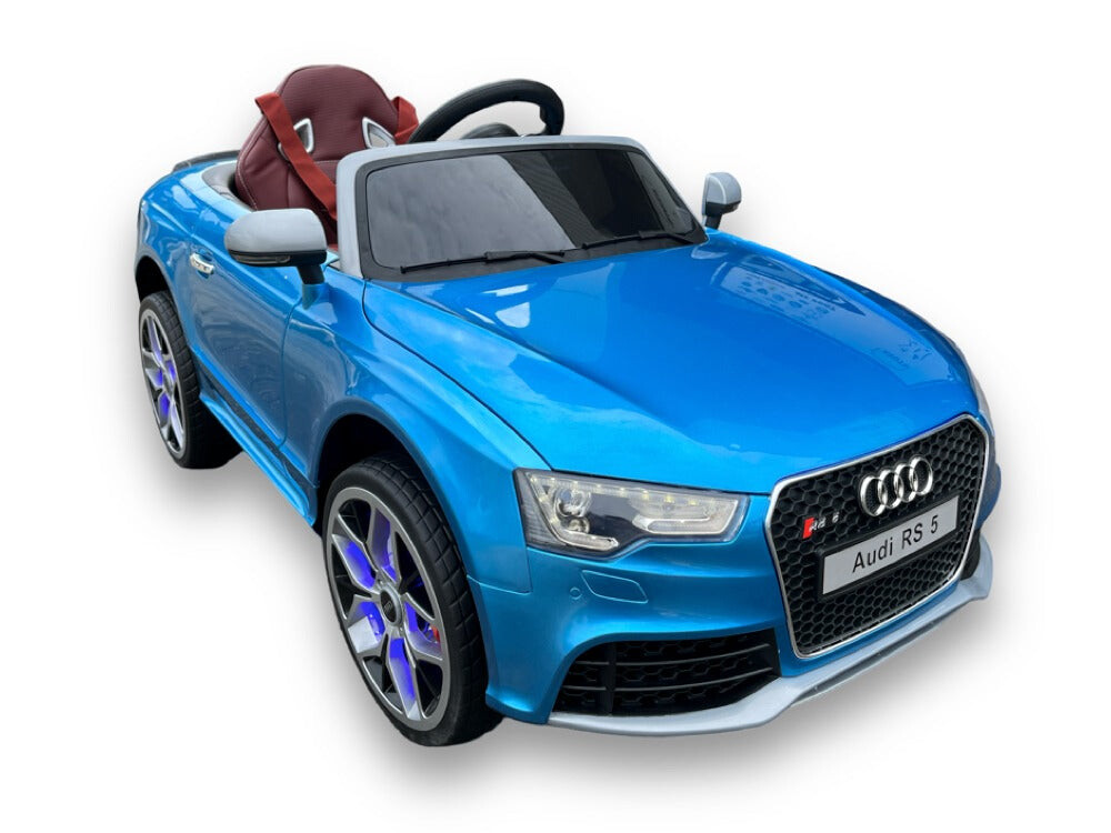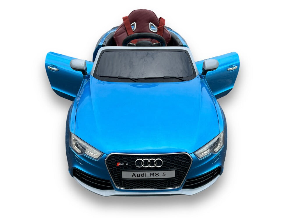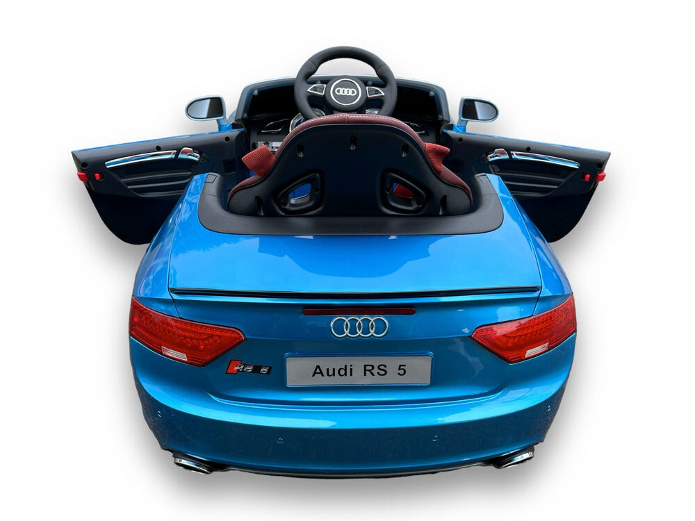Audi RS5 hoogglans blauw Vermogen/accu: 12 volt 7Ah accu Motor: 2x 12 volt 35 watt motoren, een motor op elk achterwiel Rijden: 3 instelbare snelheden tussen 3 en 4,5 km per uur, rijdt zowel vooruit als achteruit met ‘soft start’, werkt met het gaspedaal en met de afstandsbediening, elektronische rem wanneer het gaspedaal wordt losgelaten Verlichting: Ledverlichting: koplampen, achterlichten, dashboardverlichting en ledverlichting in wielen Muziek / Multimedia: Claxon en muziek- en verhaalknoppen, muziekmodule met MINI SD-, MP3- en USB-ingang om je eigen muziek af te spelen, volume is regelbaar, batterij-indicator Bijzonderheden: 2 deuren, rubberen EVA banden, kunstleren stoel met 4-punts veiligheidsgordel, achterwielophanging, bagageruimte Afstandsbediening: 2,4 GHz afstandsbediening met instelbare snelheden en pauzeknop Opladen & speeltijd: 8 uur opladen, 60-90 minuten speeltijd op een vlakke weg Inbegrepen: Afstandsbediening, batterij en oplader Aantal zitplaatsen: 1 zitplaats Geschiktheid: Voor kinderen tot 5 jaar tot 30 kg Afmetingen product: 130 x 68 x 56 cm (lengte x breedte x hoogte) Afmetingen verpakking: 135 x 66 x 38,5 cm (lengte x breedte x hoogte)