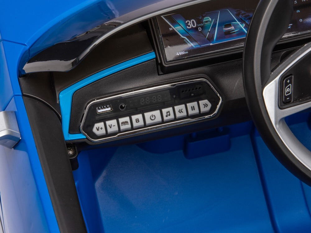 BMW i4, 12 volt, muziekmodule, leren zetel, rubberen banden (JE1009) Vermogen/accu: 12 volt 7Ah accu Motor: 2x 12 volt 35 watt motoren, één motor op elk achterwiel Rijden: 2 instelbare snelheden tot 6 km per uur, rijdt zowel vooruit als achteruit met ‘soft start’, werkt met het gaspedaal en met de afstandsbediening, elektronische rem wanneer het gaspedaal wordt losgelaten Verlichting: Led-verlichting: koplampen, achterlichten, dashboardverlichting, verlichte beenruimte Muziek / Multimedia: Claxon en muziek- en verhaaltoetsen, muziekmodule met MP3-, USB-ingang om je eigen muziek af te spelen, volume is regelbaar, batterij-indicator Bijzonderheden: 2 deuren, rubberen EVA banden, kunstlederen stoel met 5-punts veiligheidsgordel, achterwielophanging, verlichte wielen, verstelbare stoel, handgreep met kleine wieltjes om hem te verslepen als een koffer, hoogglans lak Afstandsbediening: 2,4 GHz afstandsbediening met instelbare snelheden en pauzeknop Opladen & speeltijd: 8 uur opladen, 60-90 minuten speeltijd op een vlakke weg