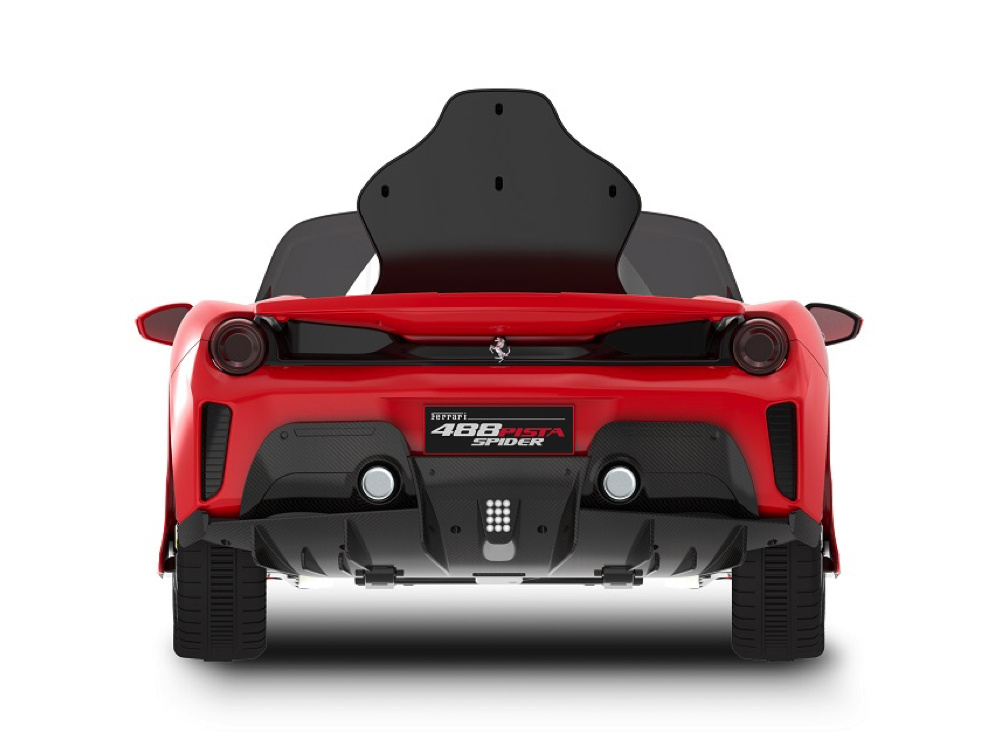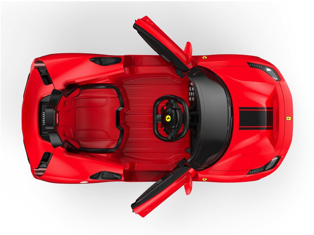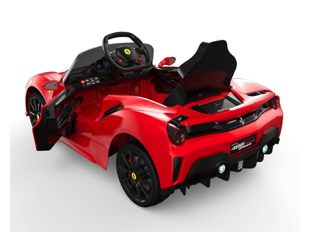 De Ferrari 488 Spider is niet alleen snel en elegant, maar ook voorzien van vermakelijke extra’s. Met ledverlichting in de koplampen, achterlampen en dashboardverlichting blijft de auto opvallend, zelfs ’s avonds. Realistische motorstartgeluiden voegen een vleugje authenticiteit toe, terwijl de toeter en muziekknopjes voor extra plezier zorgen. De ingebouwde muziekmodule met MP3- en USB-ingangen geeft kinderen de vrijheid om hun eigen muziek af te spelen. Het volume is verstelbaar en een handige batterij-indicator houdt ouders op de hoogte van de accustatus.